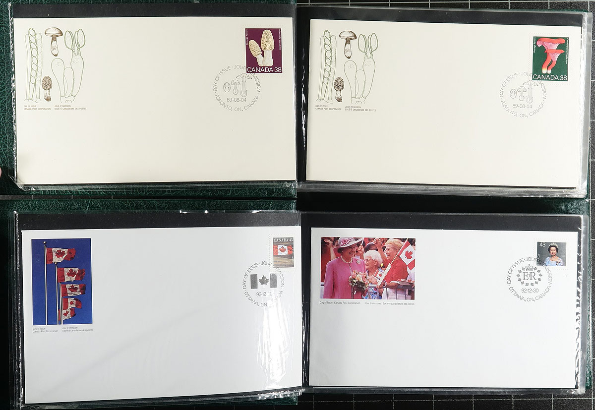 First Day Covers. Clean collection of roughly 550 first day covers, neatly organized in 6 Unisafe cover albums, 1977-1993. We note singles, sets, plate blocks, booklet panes, and high denomination frankings, with some covers cataloguing $5 and up each. A nice clean lot for collectors and dealers alike, with the albums retailing over $100 alone. Estimate =