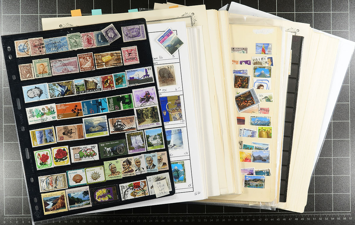 Accumulations of used New Zealand, 1863-2001, containing a likely few thousand stamps in several album or stock pages. The lot generally consists of three part collections, along with accumulations in manila stock pages, generally ranging from Scott #14/1730, along with semi-postals, airmails, and other back of the book issues. A very cursory check indicated early #s 14 (c.v. $115), 39, 41 ($75), 52-53, 55, 61-63, 65, 67A, 68, along with singles, sets, and partial sets, with a few cataloguing $10 to $20 each and up. Owner's 2014 Scott catalogue value for the lot totals $1,217 (roughly 75% of the lot has been catalogued). A good lot for the New Zealand or Commonwealth collector, a few faults with a few of the early issues, overall fine to very fine. Estimate =