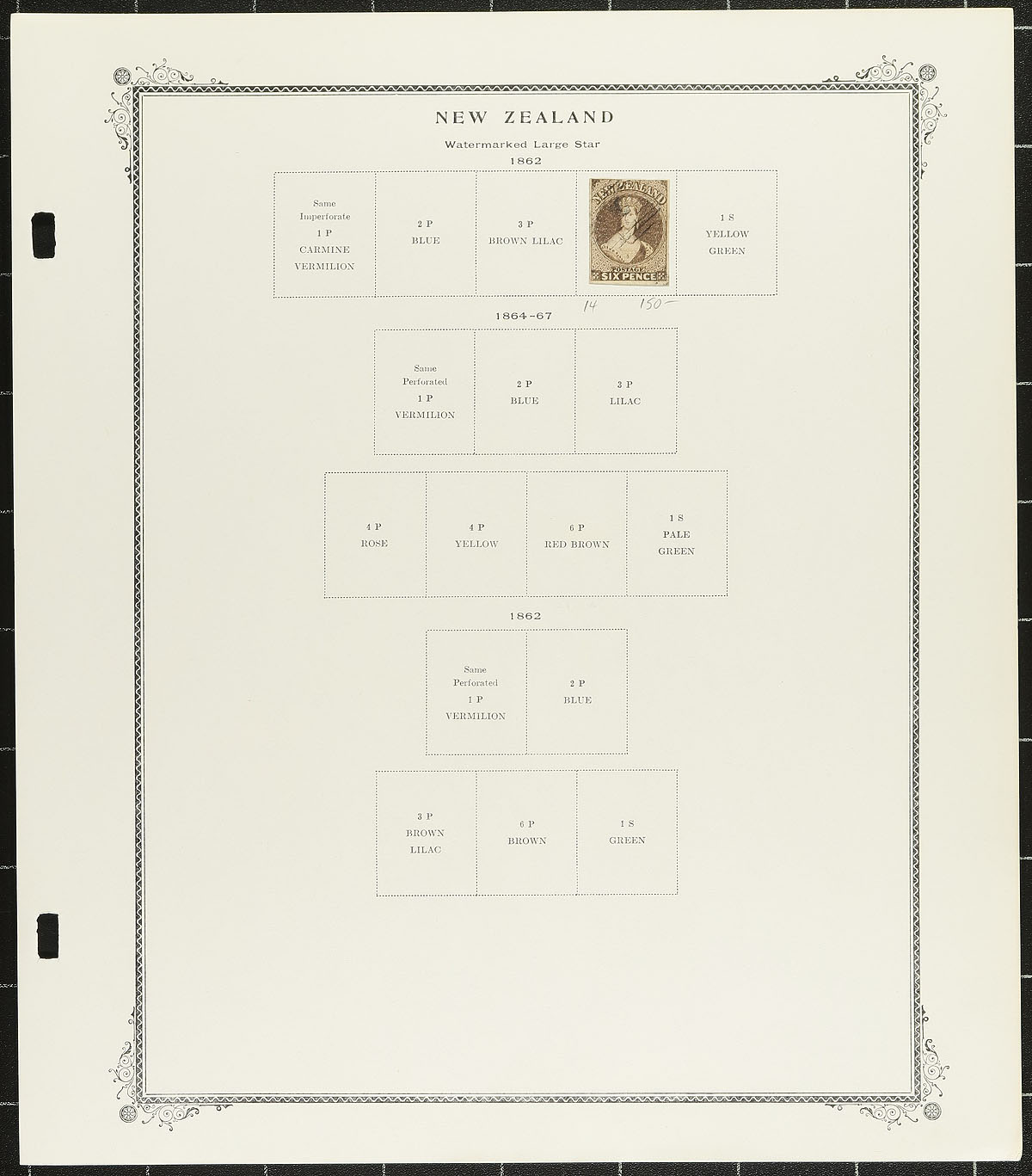 Accumulations of used New Zealand, 1863-2001, containing a likely few thousand stamps in several album or stock pages. The lot generally consists of three part collections, along with accumulations in manila stock pages, generally ranging from Scott #14/1730, along with semi-postals, airmails, and other back of the book issues. A very cursory check indicated early #s 14 (c.v. $115), 39, 41 ($75), 52-53, 55, 61-63, 65, 67A, 68, along with singles, sets, and partial sets, with a few cataloguing $10 to $20 each and up. Owner's 2014 Scott catalogue value for the lot totals $1,217 (roughly 75% of the lot has been catalogued). A good lot for the New Zealand or Commonwealth collector, a few faults with a few of the early issues, overall fine to very fine. Estimate =