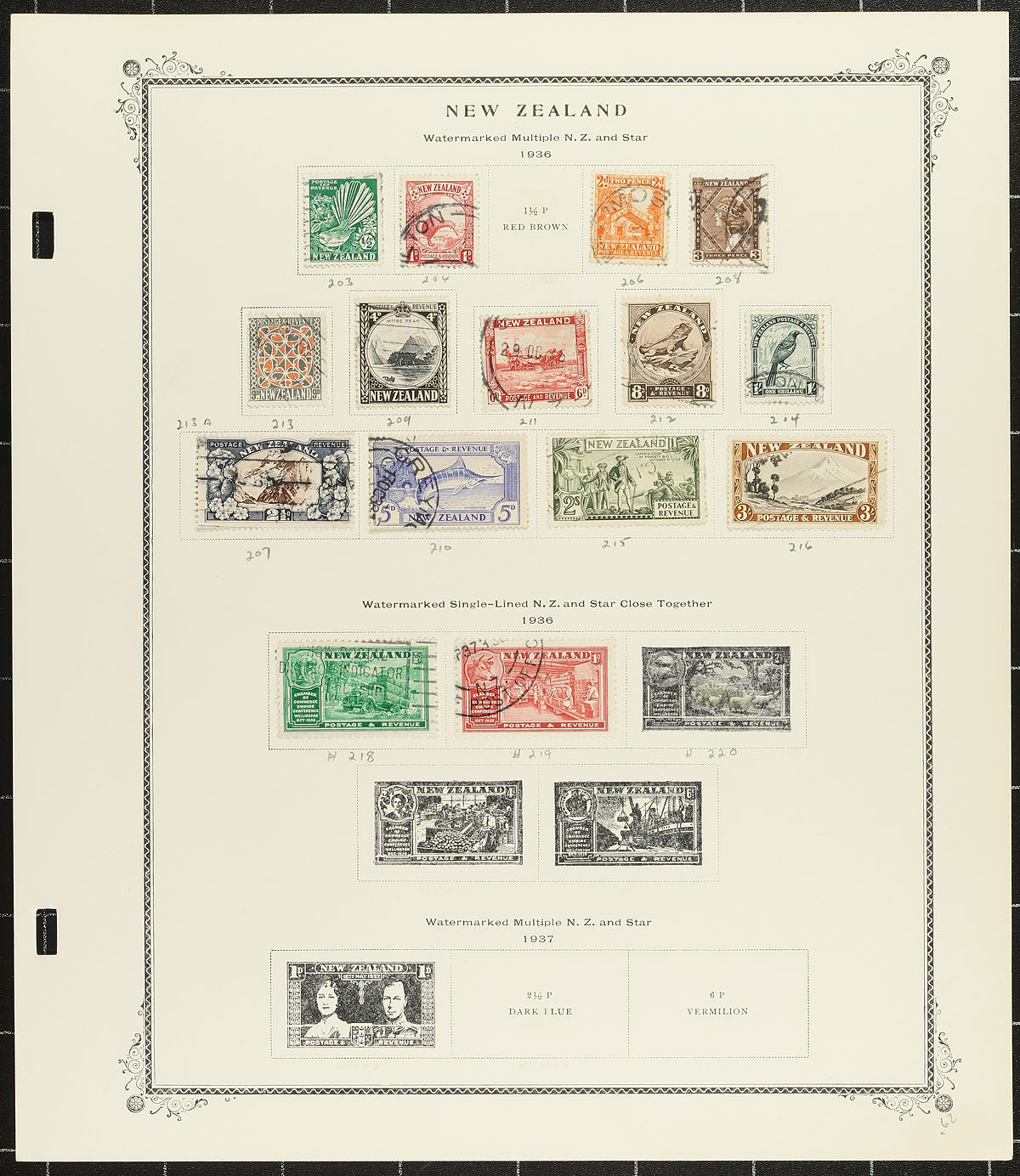 Accumulations of used New Zealand, 1863-2001, containing a likely few thousand stamps in several album or stock pages. The lot generally consists of three part collections, along with accumulations in manila stock pages, generally ranging from Scott #14/1730, along with semi-postals, airmails, and other back of the book issues. A very cursory check indicated early #s 14 (c.v. $115), 39, 41 ($75), 52-53, 55, 61-63, 65, 67A, 68, along with singles, sets, and partial sets, with a few cataloguing $10 to $20 each and up. Owner's 2014 Scott catalogue value for the lot totals $1,217 (roughly 75% of the lot has been catalogued). A good lot for the New Zealand or Commonwealth collector, a few faults with a few of the early issues, overall fine to very fine. Estimate =