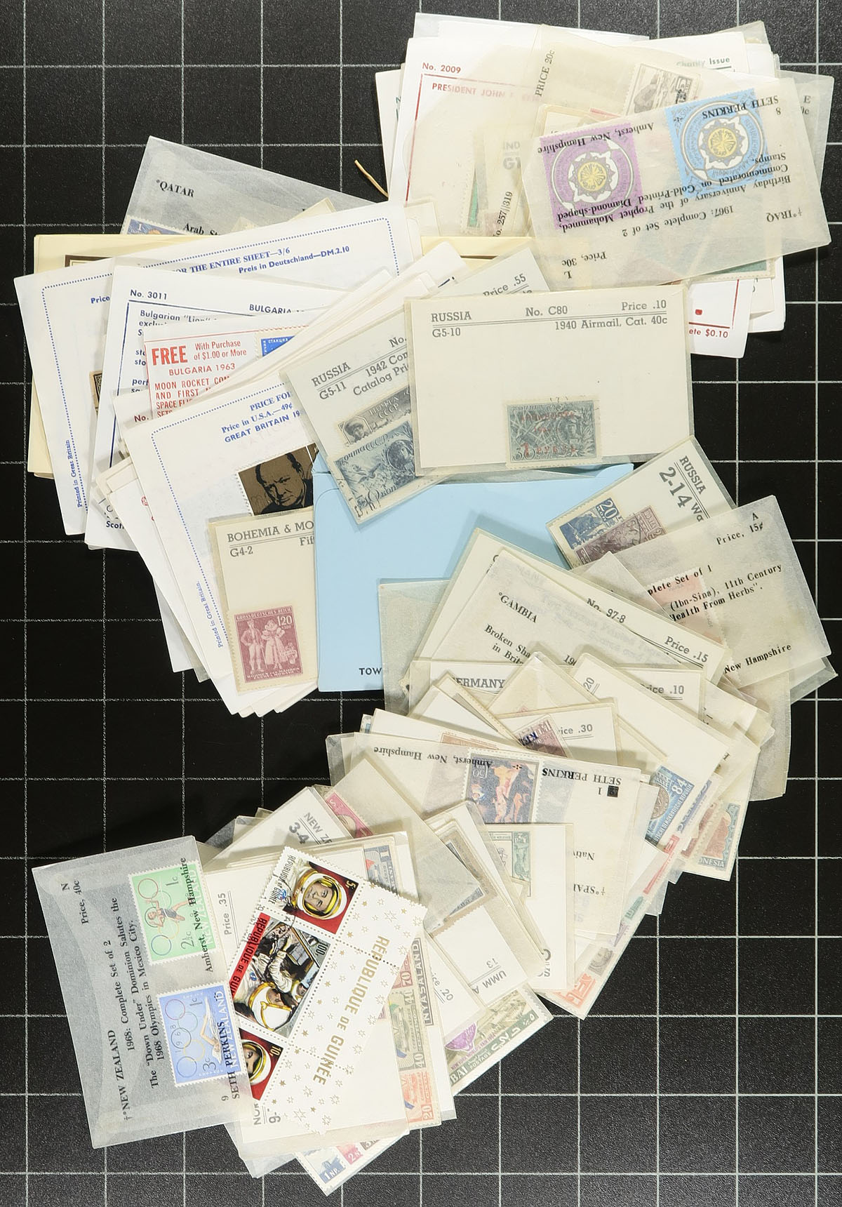Huge accumulation of mint worldwide topicals, containing several thousands of stamps neatly organized into 2 red boxes, glassines, and baggies. A cursory check indicated material from mostly British Commonwealth areas, generally from the 1960's to the 1980's, with singles, sets, sheets, etc. Just a few of the subjects include Soccer (footy for most of us), royalty, nature, sports, trains and transportation, and more. The lot also includes mint and used stamps from approval sales, noting a few items cataloguing $2 to $5 each. Duplication is heavy for most topical issues with 50 to 100 each. Should be worth a look for topical and thematic collectors, overall fine to very fine. Estimate =