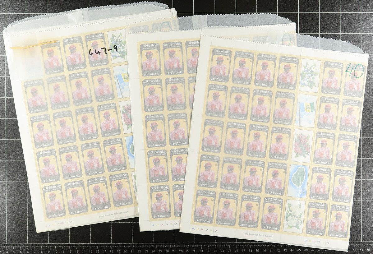 Huge accumulation of mint worldwide topicals, containing several thousands of stamps neatly organized into 2 red boxes, glassines, and baggies. A cursory check indicated material from mostly British Commonwealth areas, generally from the 1960's to the 1980's, with singles, sets, sheets, etc. Just a few of the subjects include Soccer (footy for most of us), royalty, nature, sports, trains and transportation, and more. The lot also includes mint and used stamps from approval sales, noting a few items cataloguing $2 to $5 each. Duplication is heavy for most topical issues with 50 to 100 each. Should be worth a look for topical and thematic collectors, overall fine to very fine. Estimate =