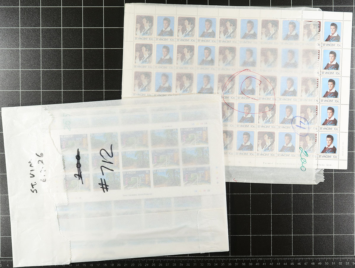 Huge accumulation of mint worldwide topicals, containing several thousands of stamps neatly organized into 2 red boxes, glassines, and baggies. A cursory check indicated material from mostly British Commonwealth areas, generally from the 1960's to the 1980's, with singles, sets, sheets, etc. Just a few of the subjects include Soccer (footy for most of us), royalty, nature, sports, trains and transportation, and more. The lot also includes mint and used stamps from approval sales, noting a few items cataloguing $2 to $5 each. Duplication is heavy for most topical issues with 50 to 100 each. Should be worth a look for topical and thematic collectors, overall fine to very fine. Estimate =