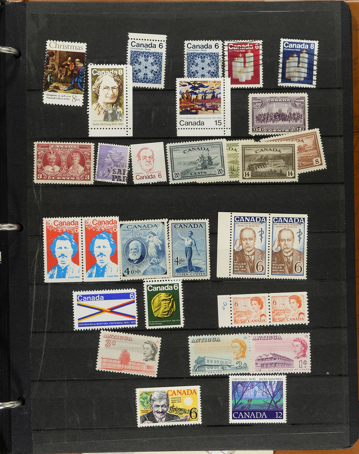 Accumulation of primarily mint British Commonwealth stamps, 1950's-1970's, containing many hundreds of stamps in several stock pages in 5 binders. A cursory check indicated primarily material from Australia, New Zealand (and from the Pacific Islands), Canada, British West Indies and Africa, noting singles, sets, partial sets, and a few souvenir sheets. Catalogue values for single issues generally range from $2 and under, but did note a few singles and partial sets cataloguing $7 to $15 and up each. A nice lot with potential finds for the dedicated collectors, overall fine to very fine. Estimate =