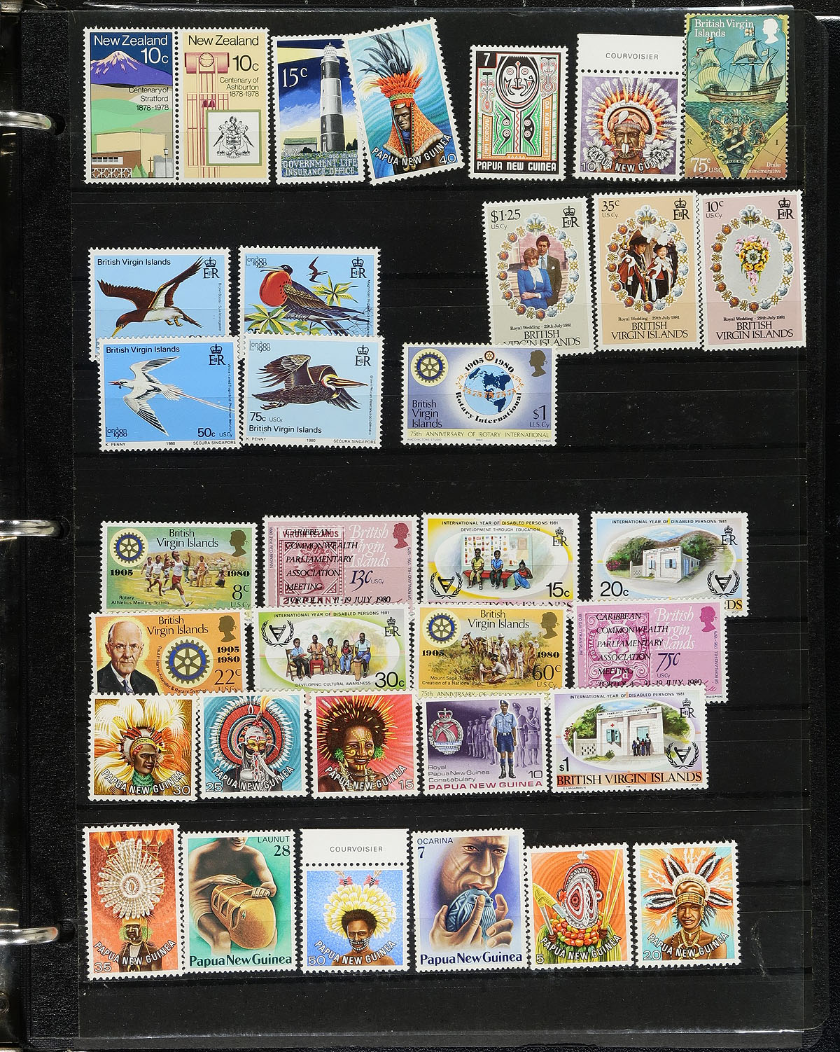 Accumulation of primarily mint British Commonwealth stamps, 1950's-1970's, containing many hundreds of stamps in several stock pages in 5 binders. A cursory check indicated primarily material from Australia, New Zealand (and from the Pacific Islands), Canada, British West Indies and Africa, noting singles, sets, partial sets, and a few souvenir sheets. Catalogue values for single issues generally range from $2 and under, but did note a few singles and partial sets cataloguing $7 to $15 and up each. A nice lot with potential finds for the dedicated collectors, overall fine to very fine. Estimate =