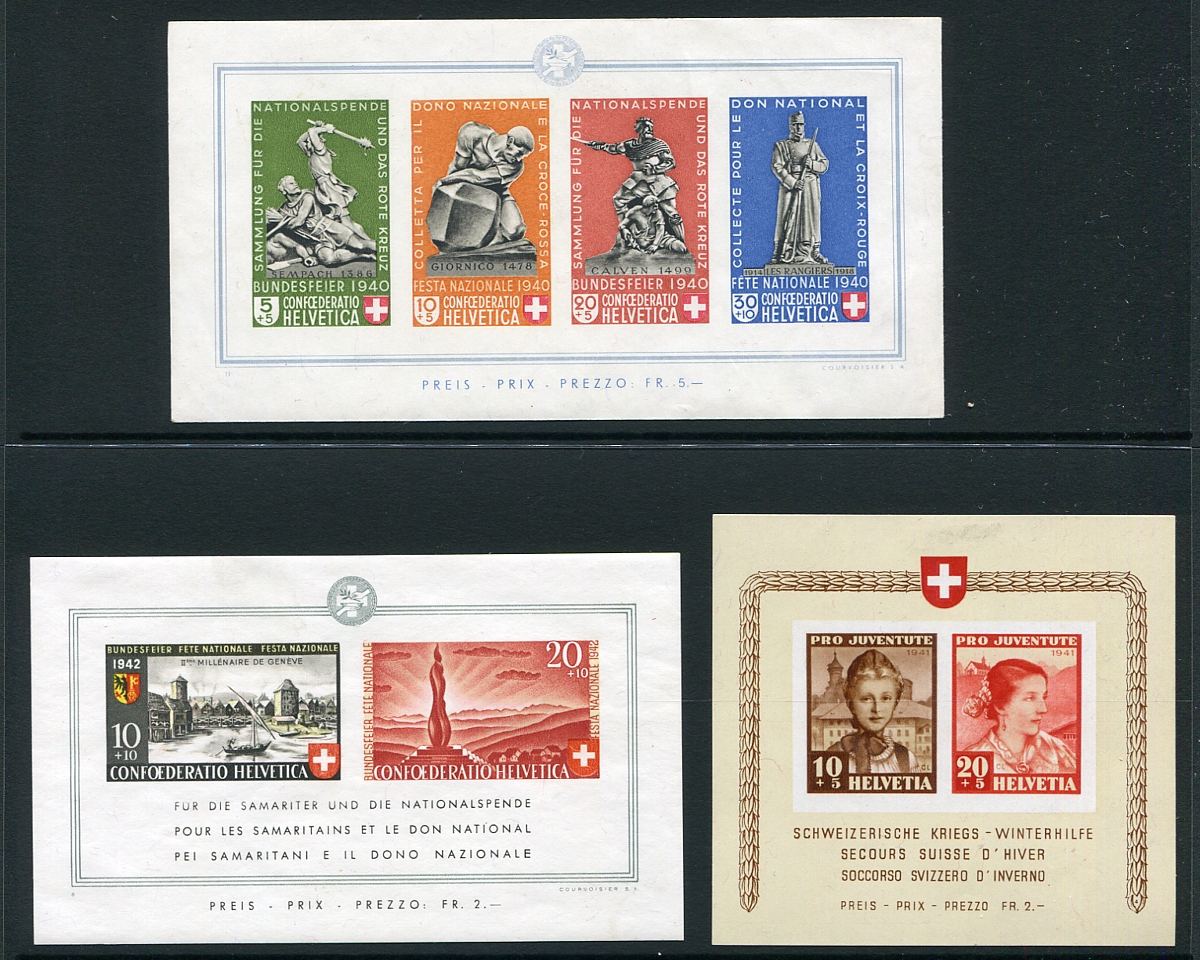 Attractive mint trio of 1940-1942 Swiss semi-postal souvenir sheets, including the 1940 National Day issue (NH, but gum a bit glazed, counted as hinged), 1941 Pro Juventute (Lightly Hinged) and 1942 National Day (Never Hinged). 2025 Scott US$310.00 =