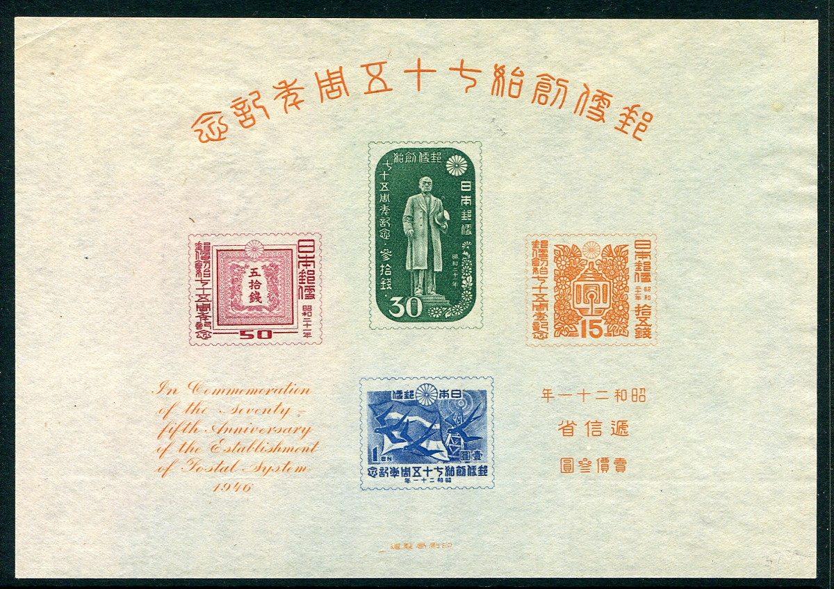 VF mint Never Hinged example of the 1946 souvenir sheet, issued for the 75th anniversary of Government Postal Service. A couple minor handling bends, but overall much better than usually seen for this seldom offered sheet. 2025 Scott US$200.00 =