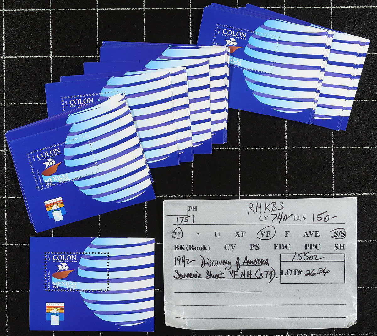 Wholesale mint Never Hinged group of 74x the 1992 Discovery of American souvenir sheet, issued in conjunction with the Genoa’92 stamp exhibition. 2025 Scott US$740.00 =