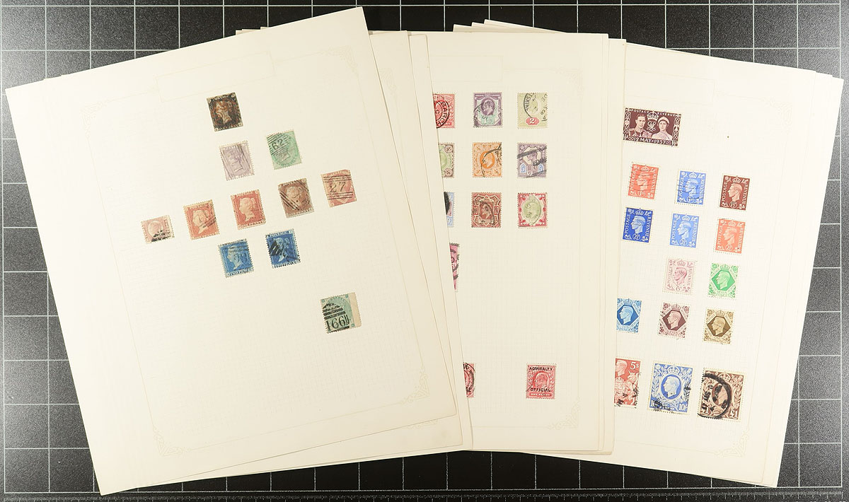 Old-time collection of used Great Britain, 1840-1951. This collection has been tucked away for several decades, containing roughly 145 stamps ranging from Scott #1/291, including several Victorian issues noting a few with #s 1 Penny Black (1 margin, position EE, c.v. $375), 20 (x3), 21 (x2), 27 ($140), 28 ($400), 41a (plate 1, $600, blunt perfs), 45 ($160), 49 (plate 9), 96 (x2), 108, and more, along with a few Seahorse and official issues. A few faults with a few stamps, still a nice little lot that should be continued. All pages photographed online. Estimate =