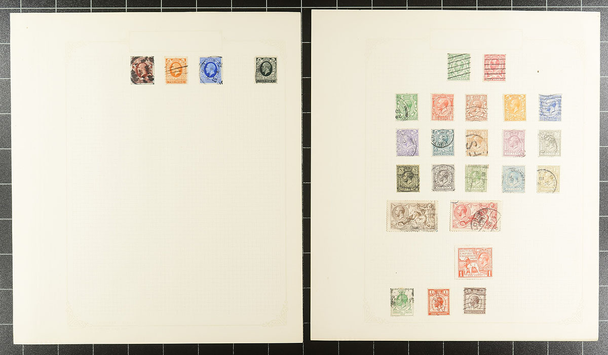 Old-time collection of used Great Britain, 1840-1951. This collection has been tucked away for several decades, containing roughly 145 stamps ranging from Scott #1/291, including several Victorian issues noting a few with #s 1 Penny Black (1 margin, position EE, c.v. $375), 20 (x3), 21 (x2), 27 ($140), 28 ($400), 41a (plate 1, $600, blunt perfs), 45 ($160), 49 (plate 9), 96 (x2), 108, and more, along with a few Seahorse and official issues. A few faults with a few stamps, still a nice little lot that should be continued. All pages photographed online. Estimate =