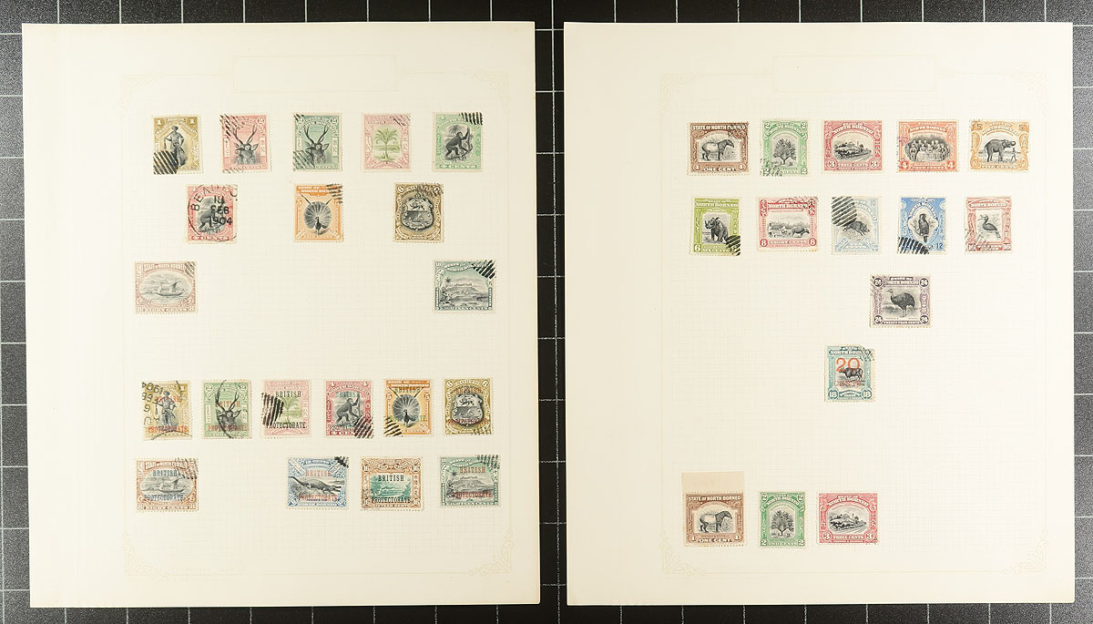 British Commonwealth. Nice old-time collection of used British Commonwealth material, 1860's-1930's, containing a few hundred stamps on 15 homemade album pages. The collection contains material from Australia (and South Australia), New Zealand, and North Borneo, noting a small selection of Kangaroos, Chalon Heads, along with postage dues, officials, and back of the book issues. A cursory check of stamps indicated a few items cataloguing $10 to $20 and up each, including Australia #45 (c.v. $100), leaving potential finds, including better postmarks to the Commonwealth collector. First time on the market in many decades, a few small faults but still a nice group. Estimate =