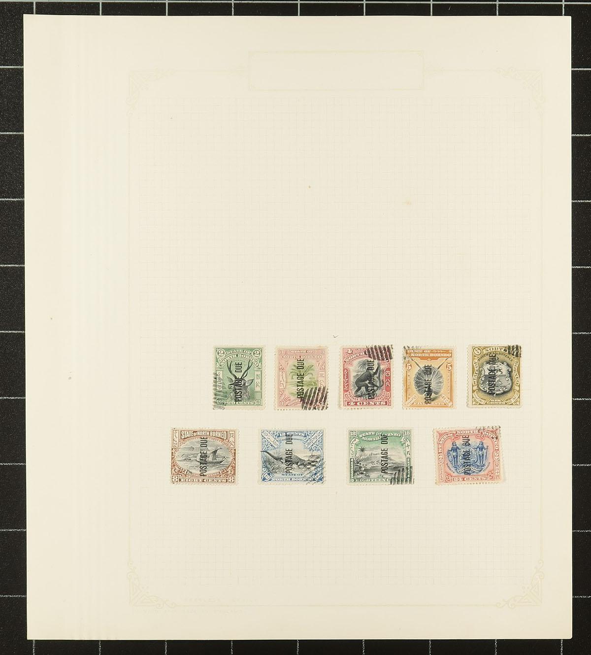 British Commonwealth. Nice old-time collection of used British Commonwealth material, 1860's-1930's, containing a few hundred stamps on 15 homemade album pages. The collection contains material from Australia (and South Australia), New Zealand, and North Borneo, noting a small selection of Kangaroos, Chalon Heads, along with postage dues, officials, and back of the book issues. A cursory check of stamps indicated a few items cataloguing $10 to $20 and up each, including Australia #45 (c.v. $100), leaving potential finds, including better postmarks to the Commonwealth collector. First time on the market in many decades, a few small faults but still a nice group. Estimate =
