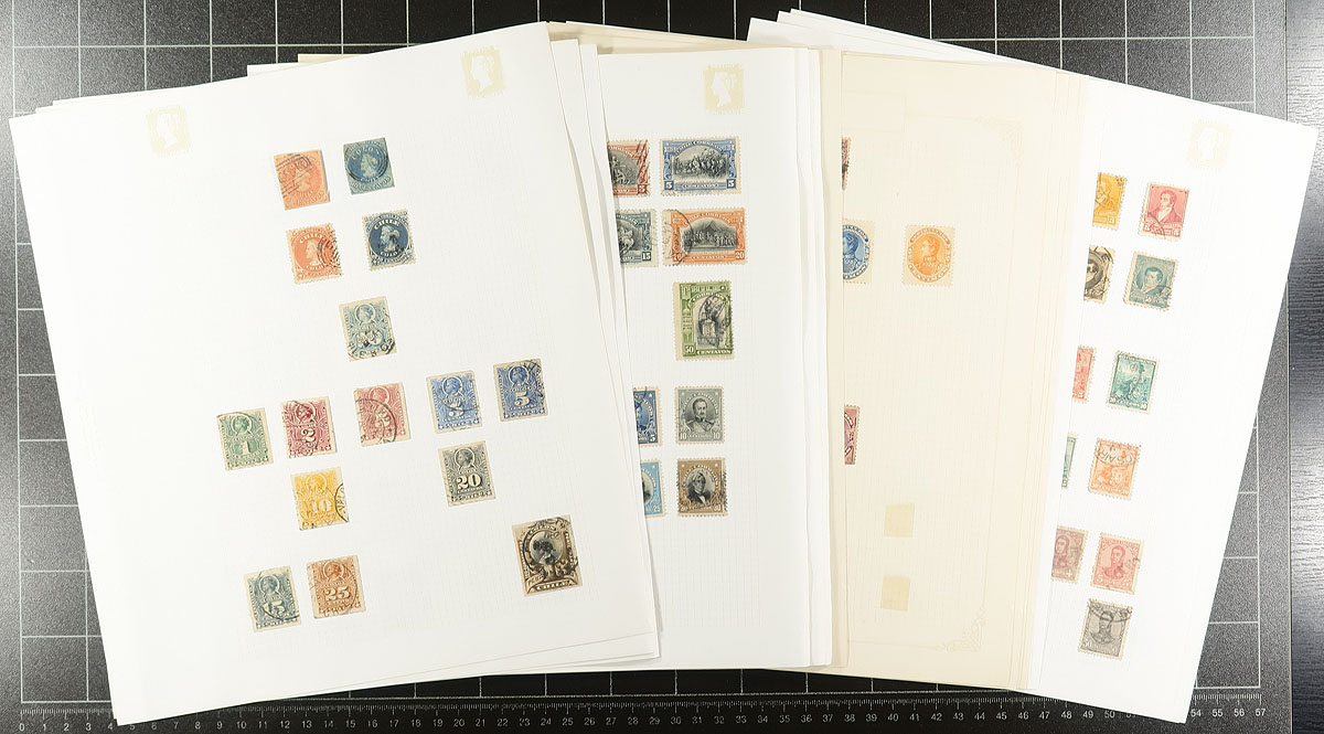 South America. Nice old-time collection of used South America material, 1860's-1930's, containing a few hundred stamps on roughly 15 homemade album pages. The collection contains material from Chile, Argentina, and Venezuela, with a spot check indicating singles, partial sets, surcharge issues, and more. Catalogue values appear to range from $3 and under, with a few cataloguing $5 and up, leaving potential finds for the dedicated collector. A nice lot from a collection that is offered for the first time in decades, a few faults with a few stamps, overall fine to very fine. Estimate =