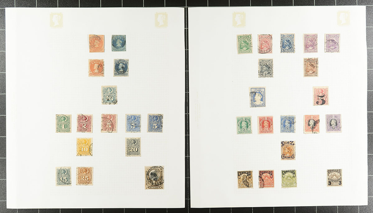 South America. Nice old-time collection of used South America material, 1860's-1930's, containing a few hundred stamps on roughly 15 homemade album pages. The collection contains material from Chile, Argentina, and Venezuela, with a spot check indicating singles, partial sets, surcharge issues, and more. Catalogue values appear to range from $3 and under, with a few cataloguing $5 and up, leaving potential finds for the dedicated collector. A nice lot from a collection that is offered for the first time in decades, a few faults with a few stamps, overall fine to very fine. Estimate =