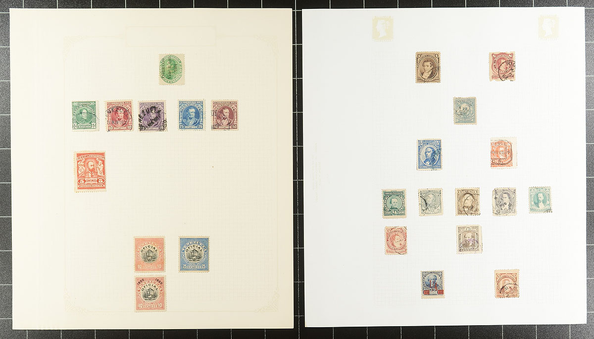 South America. Nice old-time collection of used South America material, 1860's-1930's, containing a few hundred stamps on roughly 15 homemade album pages. The collection contains material from Chile, Argentina, and Venezuela, with a spot check indicating singles, partial sets, surcharge issues, and more. Catalogue values appear to range from $3 and under, with a few cataloguing $5 and up, leaving potential finds for the dedicated collector. A nice lot from a collection that is offered for the first time in decades, a few faults with a few stamps, overall fine to very fine. Estimate =