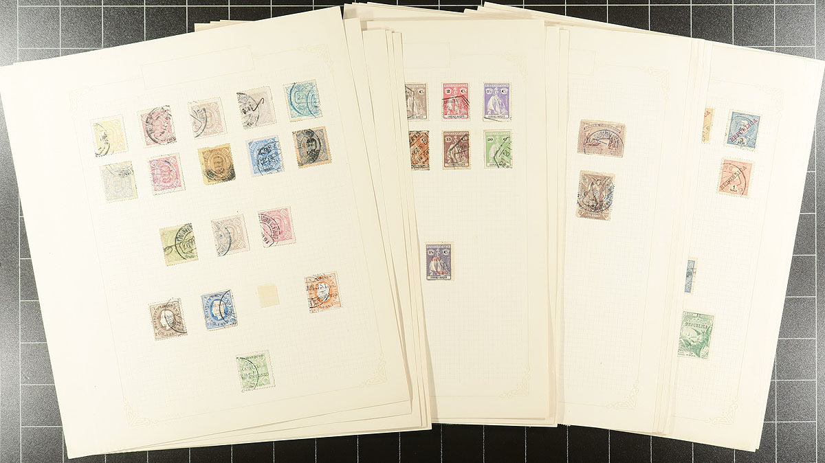 Old-time collection of used Portal and Colonies, 1870's-1930's, containing a few hundred stamps on roughly 15 homemade album pages. The collection contains material from Portugal, Portuguese India, Lourenco Marques, and perhaps a few others. A cursory check indicated singles, partial sets, and back of the book items, with a few stamps cataloguing $5 to $10 each, leaving potential finds for the dedicated collector. A nice little collection that is being offered for the first time in decades, a few small to noticeable faults with a few stamps, still a nice fine lot. Estimate =