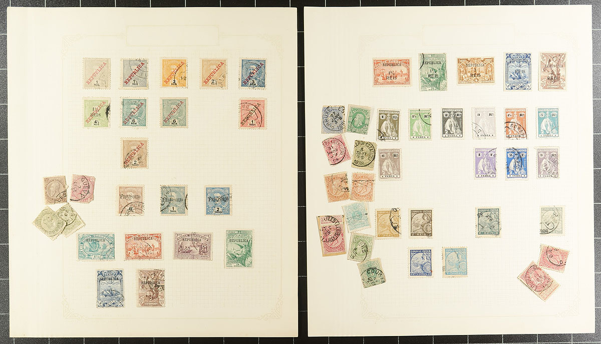 Old-time collection of used Portal and Colonies, 1870's-1930's, containing a few hundred stamps on roughly 15 homemade album pages. The collection contains material from Portugal, Portuguese India, Lourenco Marques, and perhaps a few others. A cursory check indicated singles, partial sets, and back of the book items, with a few stamps cataloguing $5 to $10 each, leaving potential finds for the dedicated collector. A nice little collection that is being offered for the first time in decades, a few small to noticeable faults with a few stamps, still a nice fine lot. Estimate =