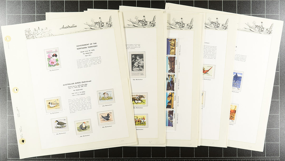 Collection of never hinged Australia, 1966-1988, containing over 700 stamps in a Seven Sea's album and in some glassines and 102 cards. The collection generally ranges from Scott #394/1085a (fairly complete in period), containing several sets, gutter pairs, and more. Owner's 2014 Scott catalogue value for the lot totals $741.00. Face value alone would be a likely few hundred dollars. A nice clean lot for collectors, dealers, or postage users. Estimate =