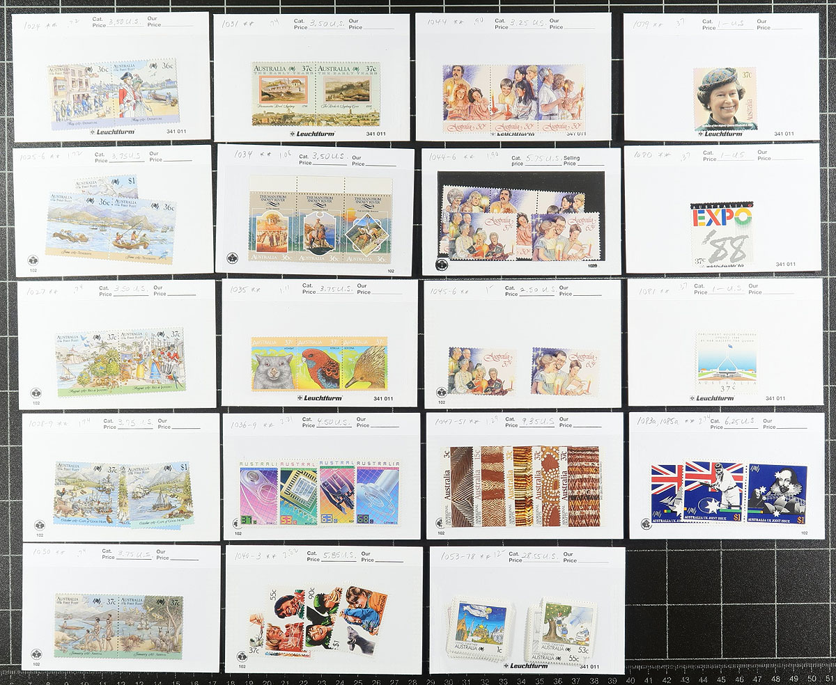 Collection of never hinged Australia, 1966-1988, containing over 700 stamps in a Seven Sea's album and in some glassines and 102 cards. The collection generally ranges from Scott #394/1085a (fairly complete in period), containing several sets, gutter pairs, and more. Owner's 2014 Scott catalogue value for the lot totals $741.00. Face value alone would be a likely few hundred dollars. A nice clean lot for collectors, dealers, or postage users. Estimate =