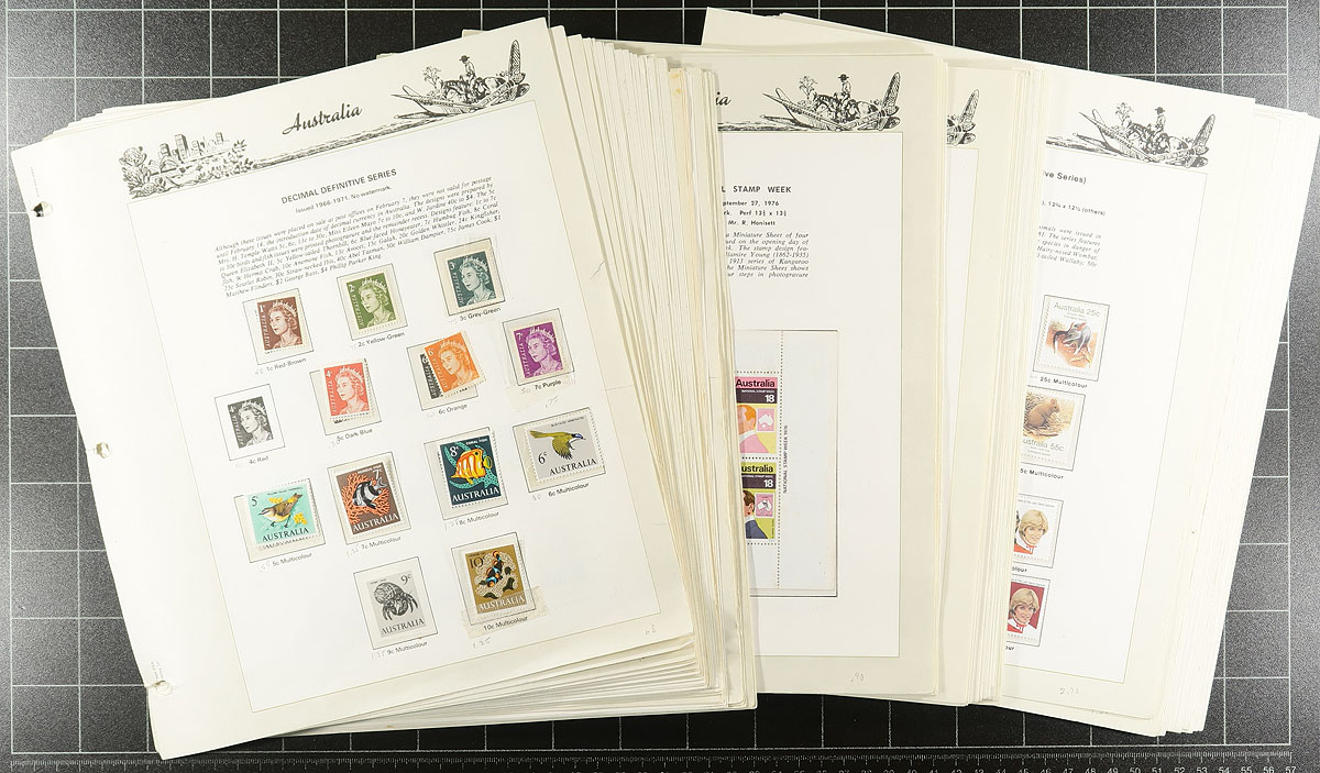 Collection of never hinged Australia, 1966-1988, containing over 700 stamps in a Seven Sea's album and in some glassines and 102 cards. The collection generally ranges from Scott #394/1085a (fairly complete in period), containing several sets, gutter pairs, and more. Owner's 2014 Scott catalogue value for the lot totals $741.00. Face value alone would be a likely few hundred dollars. A nice clean lot for collectors, dealers, or postage users. Estimate =