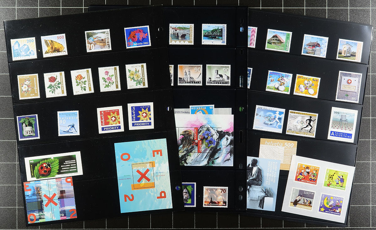 Comprehensive mint (mostly Never Hinged) collection of Post-WWII up to 2005 issues, nearly arranged in mounts on pages, and later stockpages within a binder. Looks to be about 90% full, missing the key-values, but includes "back of the book". Substantial face value alone, which should add up to 400+ Swiss Francs (over $700.00 CDN). Only a handful of earlier material here Lightly Hinged, rest Never Hinged. Value adds up quickly. Estimate =