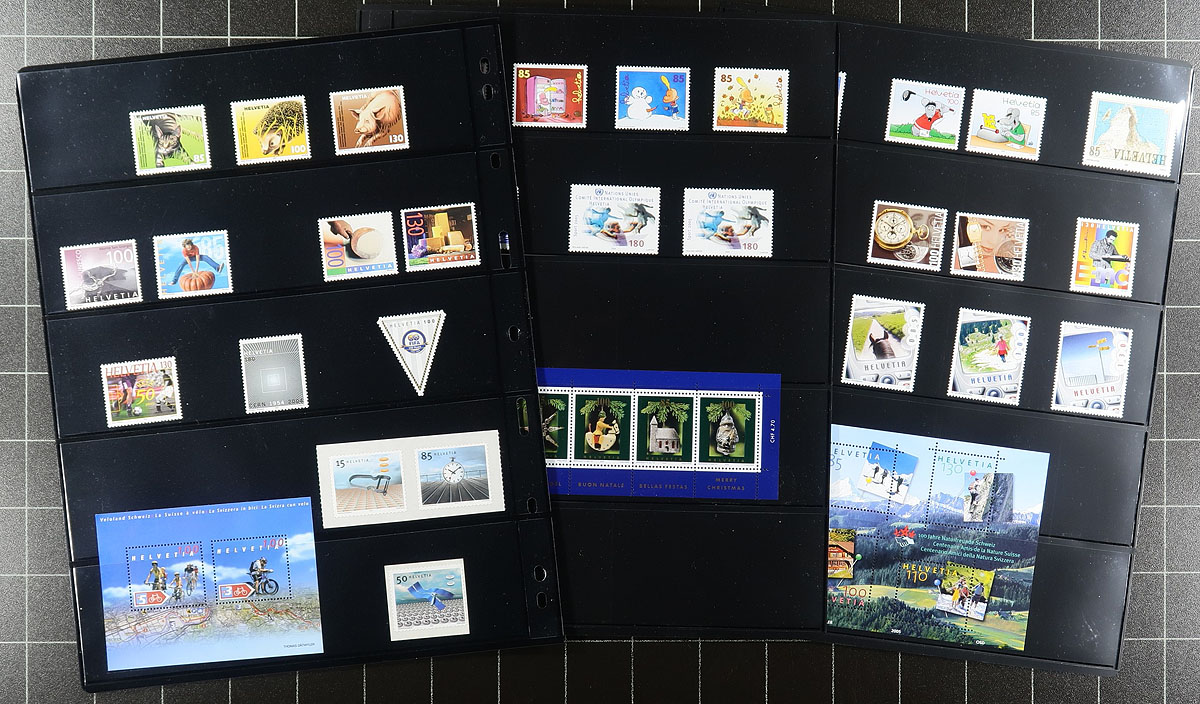 Comprehensive mint (mostly Never Hinged) collection of Post-WWII up to 2005 issues, nearly arranged in mounts on pages, and later stockpages within a binder. Looks to be about 90% full, missing the key-values, but includes "back of the book". Substantial face value alone, which should add up to 400+ Swiss Francs (over $700.00 CDN). Only a handful of earlier material here Lightly Hinged, rest Never Hinged. Value adds up quickly. Estimate =