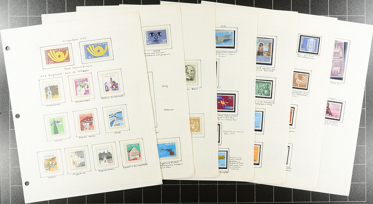 Comprehensive mint (mostly Never Hinged) collection of Post-WWII up to 2005 issues, nearly arranged in mounts on pages, and later stockpages within a binder. Looks to be about 90% full, missing the key-values, but includes "back of the book". Substantial face value alone, which should add up to 400+ Swiss Francs (over $700.00 CDN). Only a handful of earlier material here Lightly Hinged, rest Never Hinged. Value adds up quickly. Estimate =