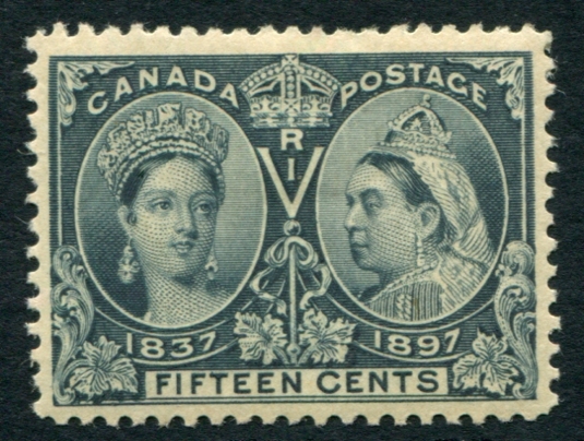 VF mint Lightly Hinged, but with glazed gum example of the 15c steel blue 1897 QV Jubilee issue. A great stamp with centering well above average. A very respectable example of this tough to find issue. 2026 Scott US$300.00 =