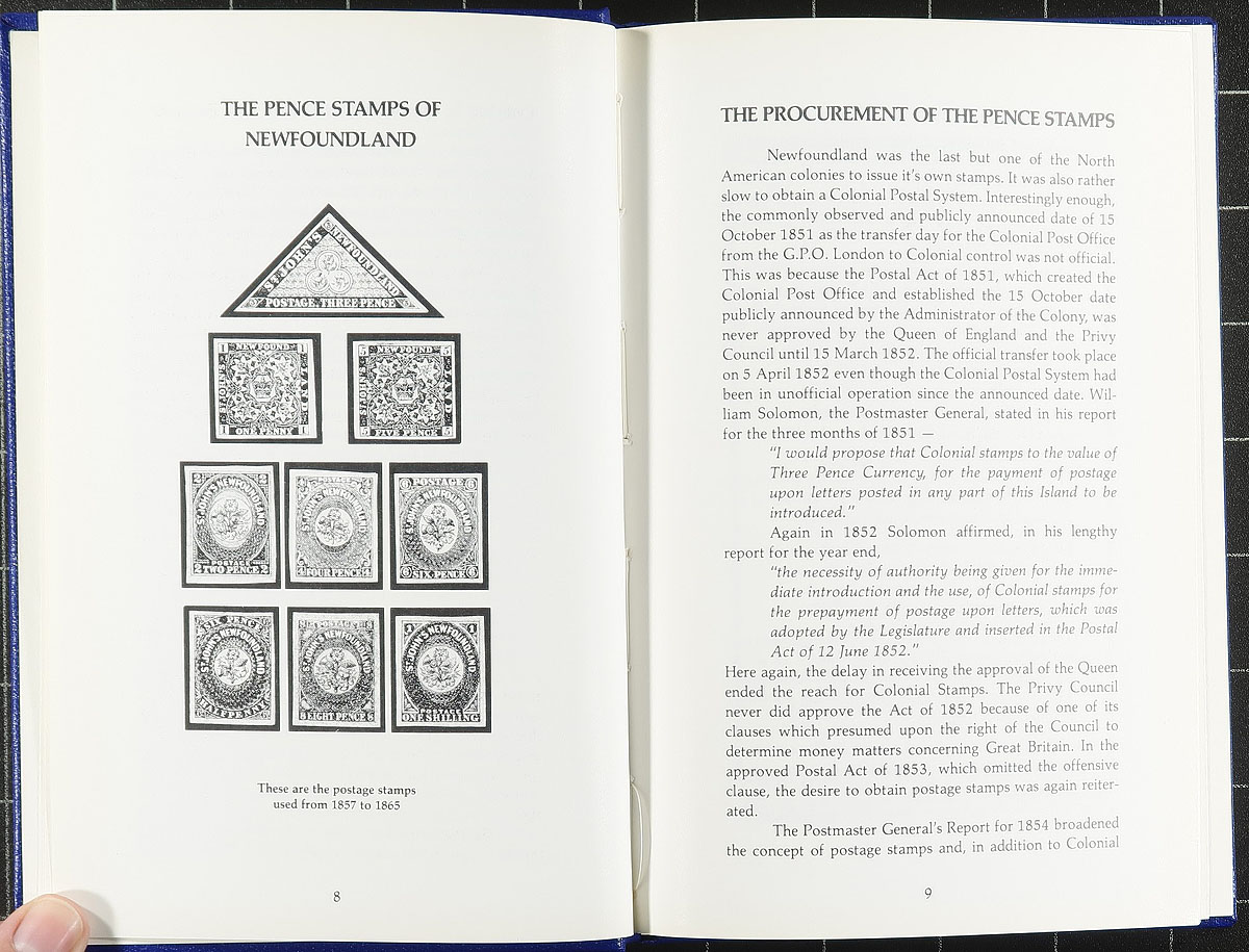 Literature. A trio of important Newfoundland philatelic reference books including "The Pence Issues of Newfoundland 1857-1866" (Pratt, 1982 hardcover, Greene Foundation published), "The Encyclopedia of British Empire Postage Stamps, Part IV, Newfoundland and British Columbia" (Robson Lowe) and "Newfoundland Air Mails 1919-1939" (Dalwick and Harmer, 1953 hardcover). All very relevant, and tough to find. Estimate =