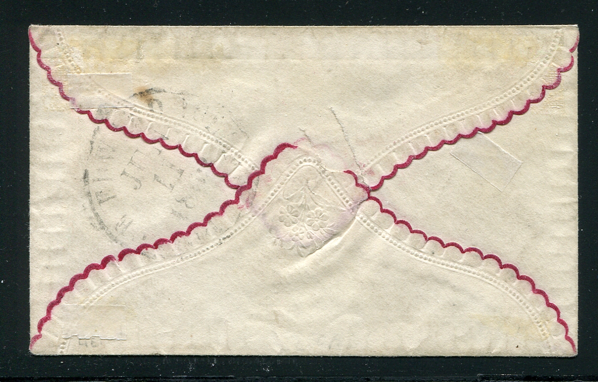 Used example on small "ladies" cover of the 1861 issue 2p dull rose, perf 9, mailed June 11th 1862 to "Ch'Town". Some usual perforation faults, but a tough stamp to find as a single, let alone used on cover. 2025-2026 Unitrade =