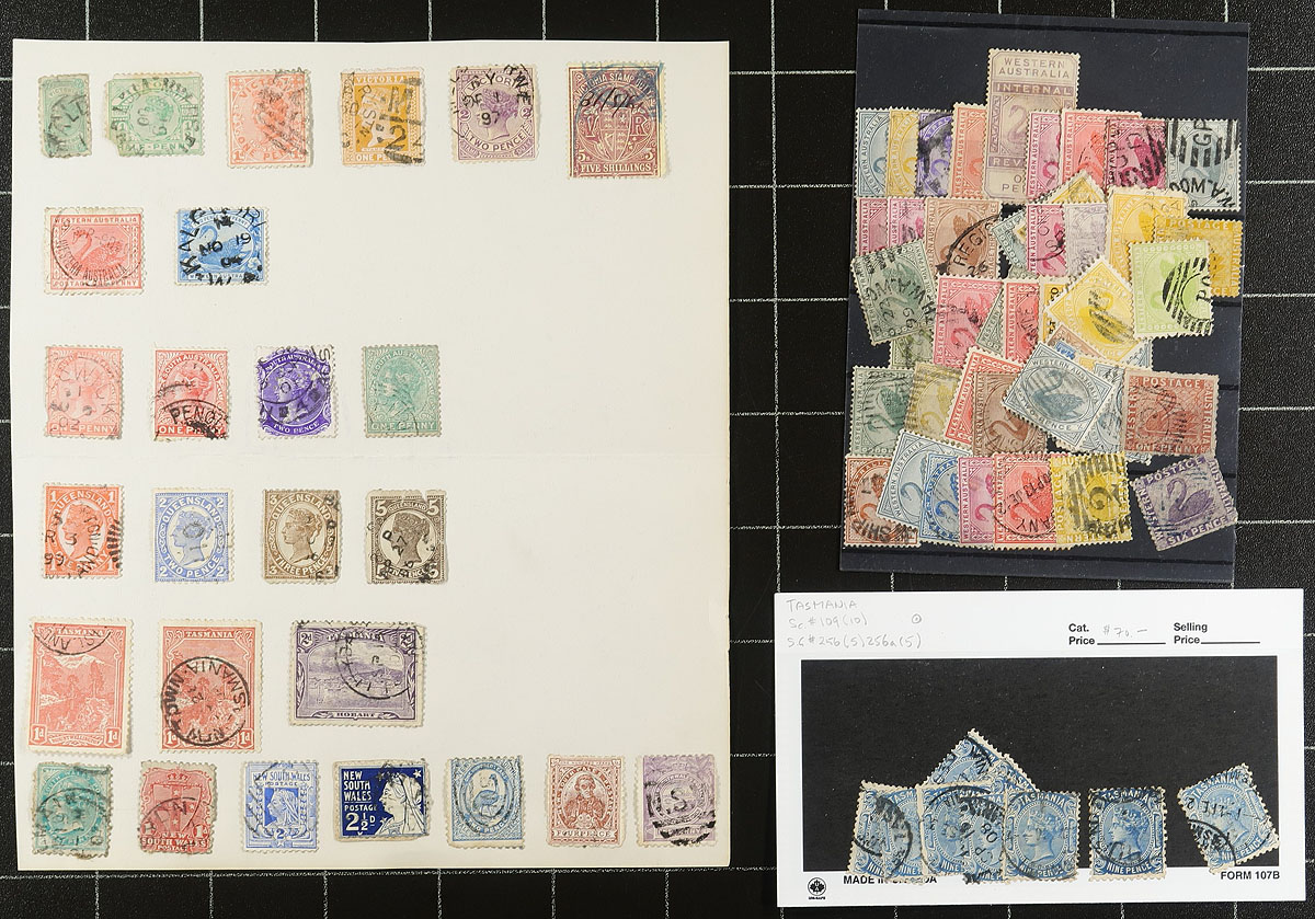 Accumulation of various Australian States stamps, with a couple hundred in "102" cards or glassines. Largely unchecked, perfect for the postmark hound. Estimate =