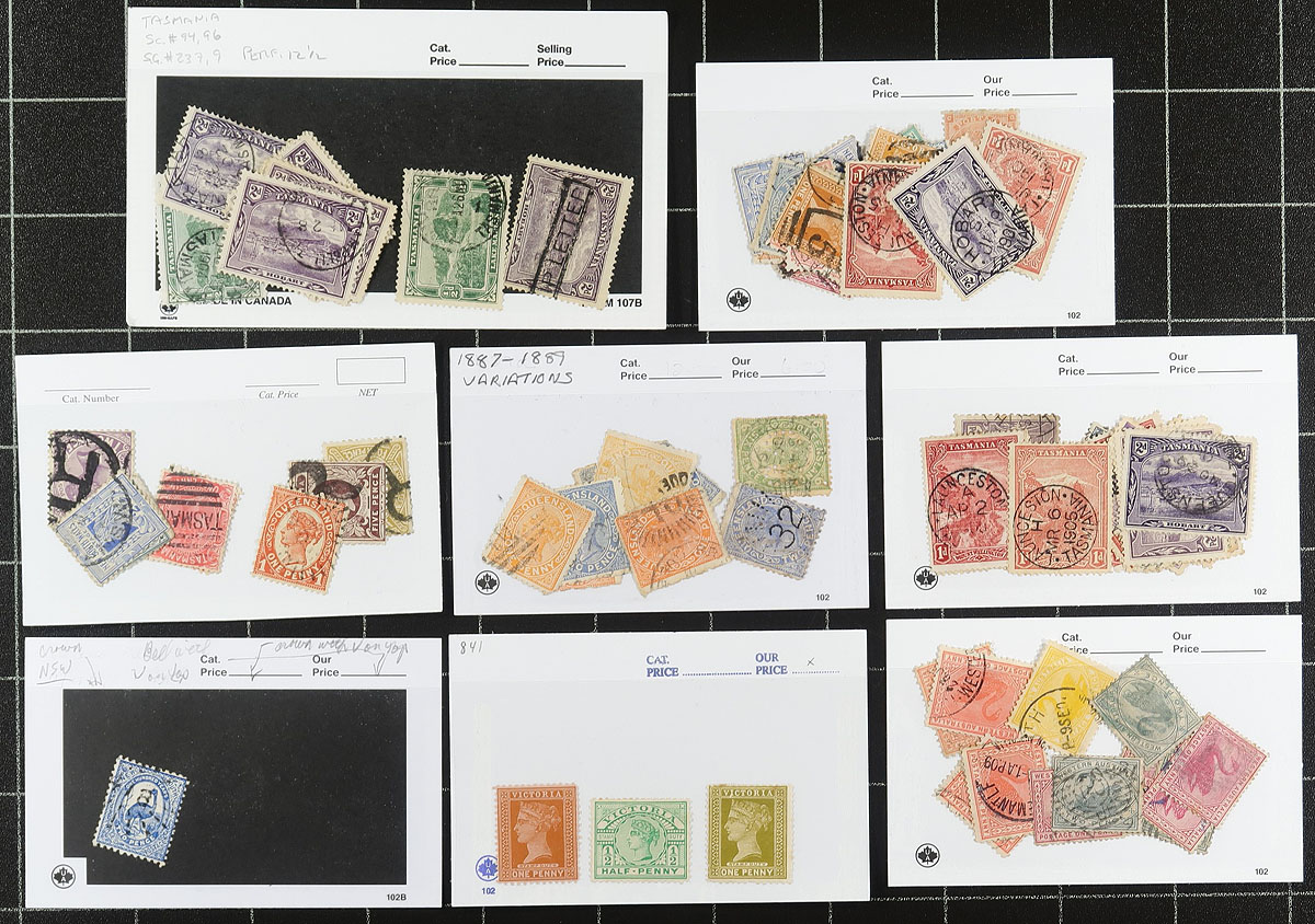 Accumulation of various Australian States stamps, with a couple hundred in "102" cards or glassines. Largely unchecked, perfect for the postmark hound. Estimate =
