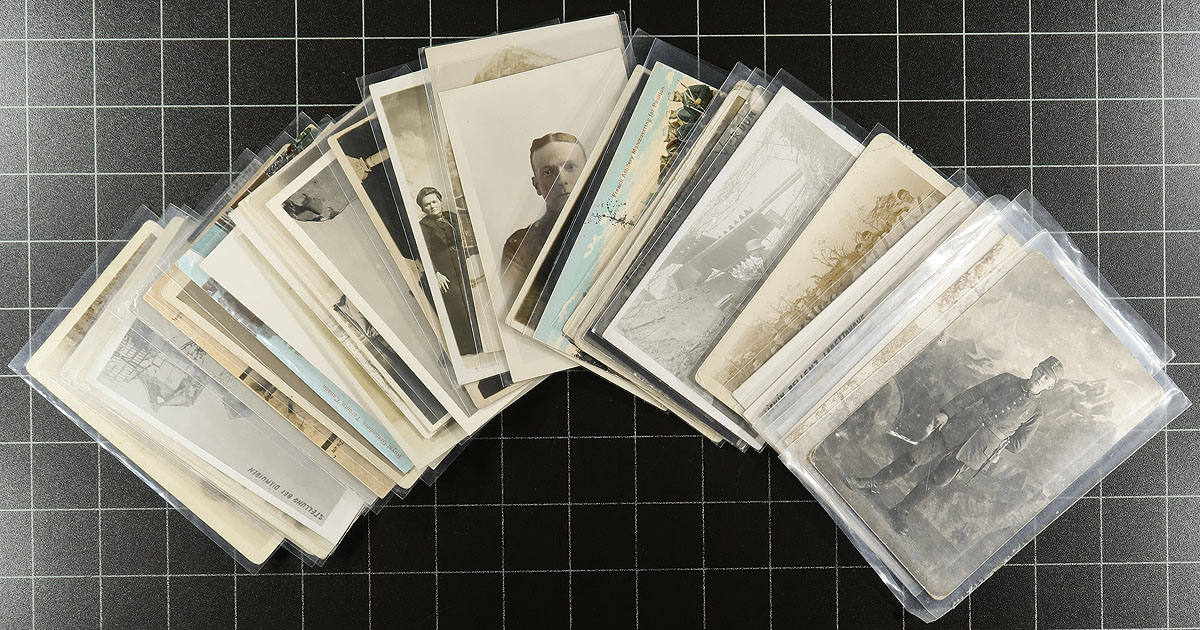 WWI grouping. A visually stunning array of 31 postcards, primarily RPPC (real photo postcards) depicting soldiers and scenes of war. A bit of research on this grouping should prove rewarding, offered as received. Estimate =