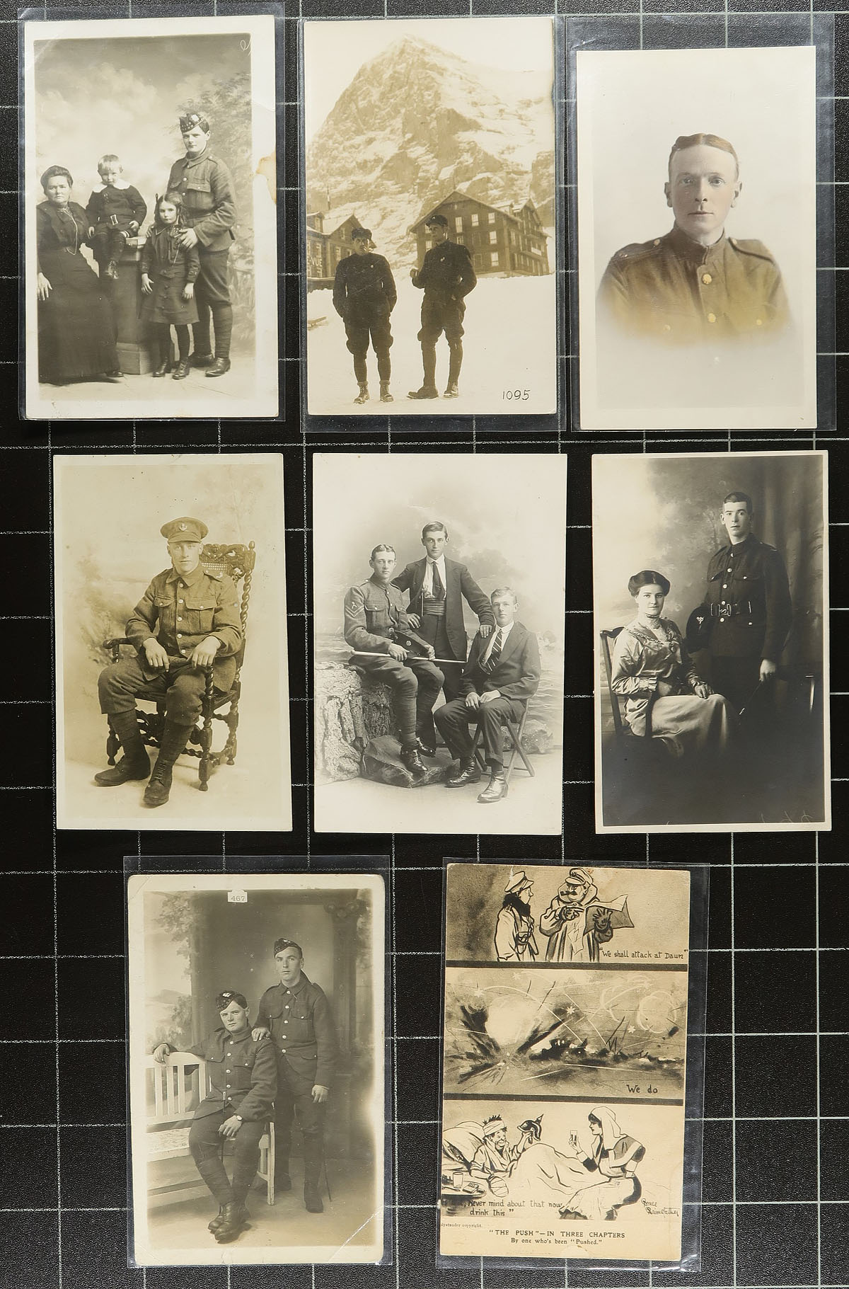 WWI grouping. A visually stunning array of 31 postcards, primarily RPPC (real photo postcards) depicting soldiers and scenes of war. A bit of research on this grouping should prove rewarding, offered as received. Estimate =