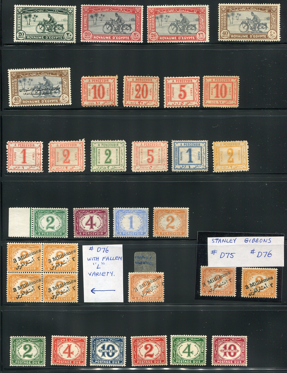 A "back of the book" study group, with Special Delivery, a bit batch of all different postage dues (including some Stanley Gibbons errors) and some military stamps including the red "Sphinx" design, including one with a Christmas 1935 overprint. All mint, with varying degrees of hinging. Scott has a note for the early postage dues stating, "Excellent counterfeits are available and plentiful". These look good, but that may fit the narrative. A great way to increase your expertise. Estimate =