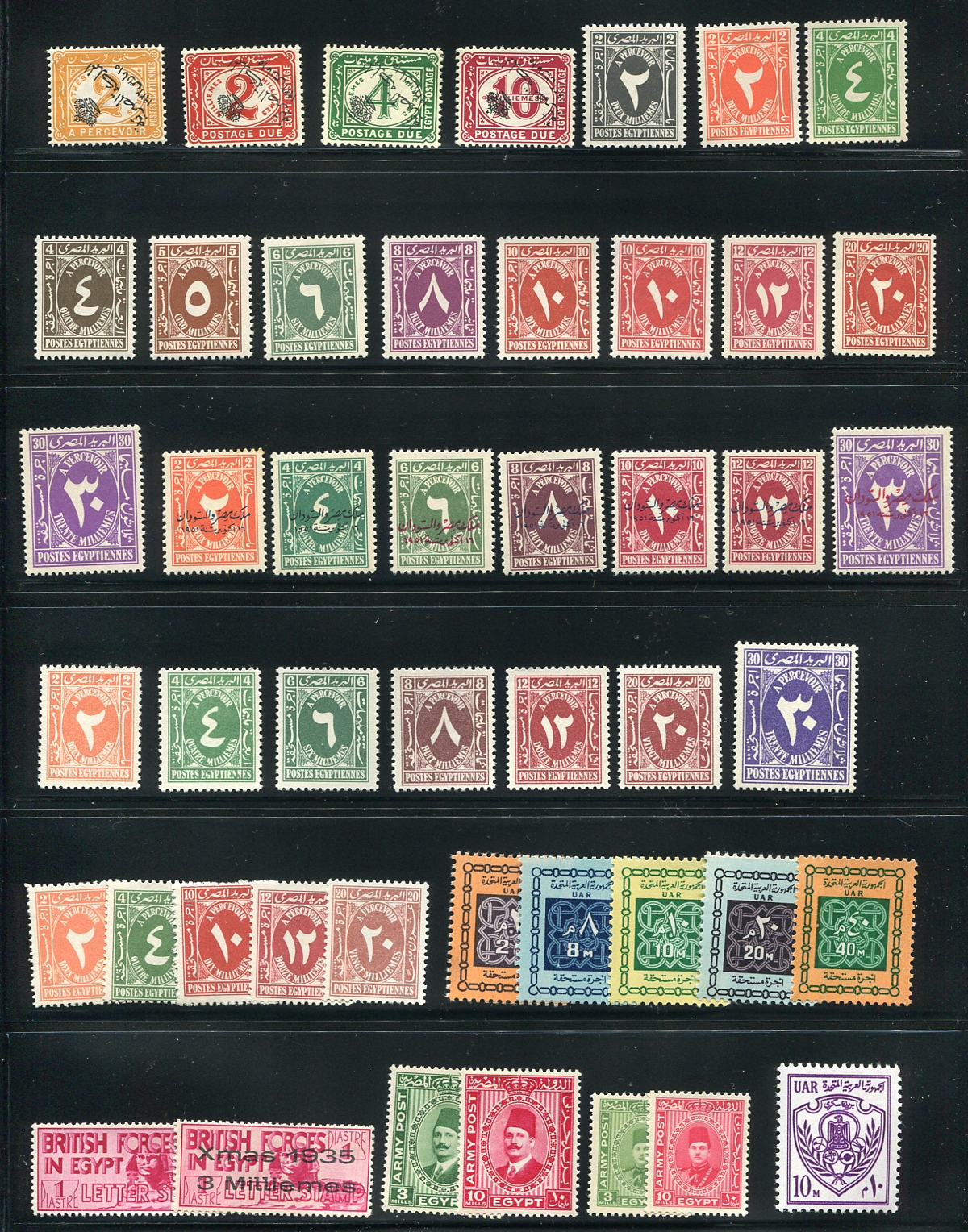 A "back of the book" study group, with Special Delivery, a bit batch of all different postage dues (including some Stanley Gibbons errors) and some military stamps including the red "Sphinx" design, including one with a Christmas 1935 overprint. All mint, with varying degrees of hinging. Scott has a note for the early postage dues stating, "Excellent counterfeits are available and plentiful". These look good, but that may fit the narrative. A great way to increase your expertise. Estimate =