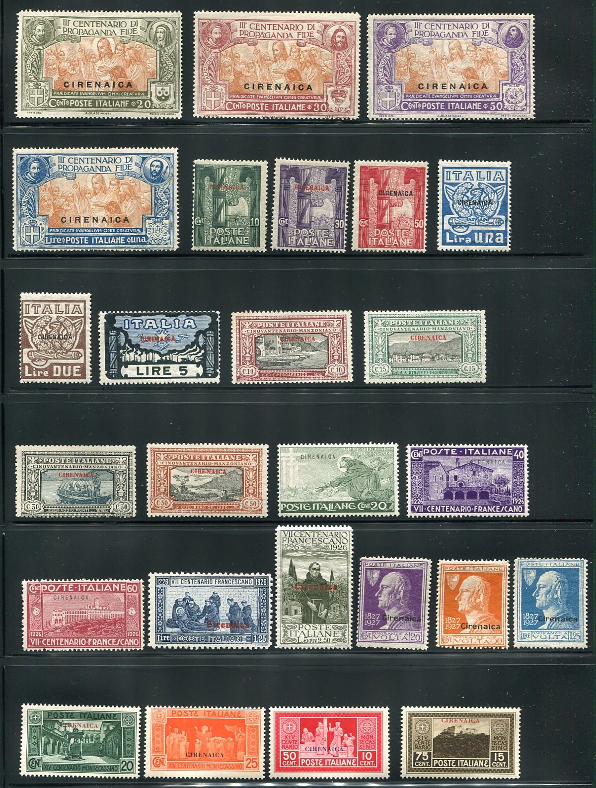 The near complete, mint, regular issues for this North African colony, missing only the 1925 Victor Emmanuel issue (sold separately in this sale) and the two high values of the Manzoni issue. An attractive, hinged, group, starting with overprints on Italian issues, and moving into its autonomous issues, before it became part of Libya. 2025 Scott US$397.05 =