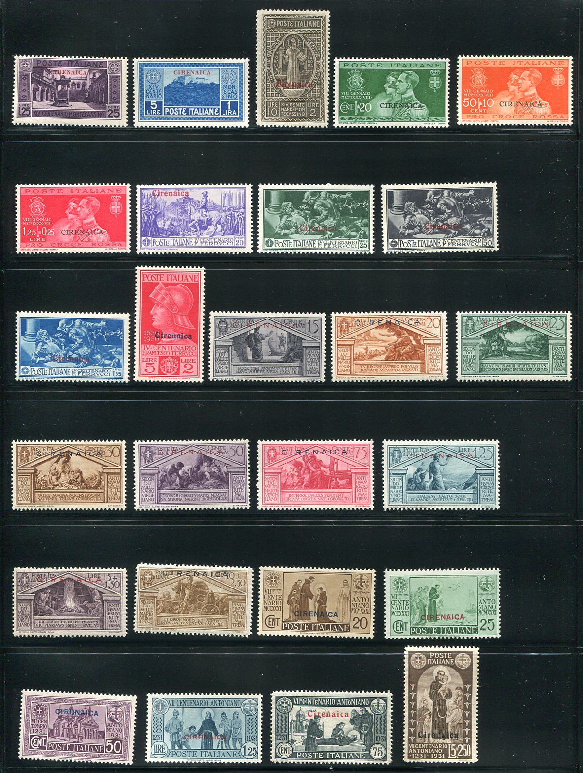 The near complete, mint, regular issues for this North African colony, missing only the 1925 Victor Emmanuel issue (sold separately in this sale) and the two high values of the Manzoni issue. An attractive, hinged, group, starting with overprints on Italian issues, and moving into its autonomous issues, before it became part of Libya. 2025 Scott US$397.05 =
