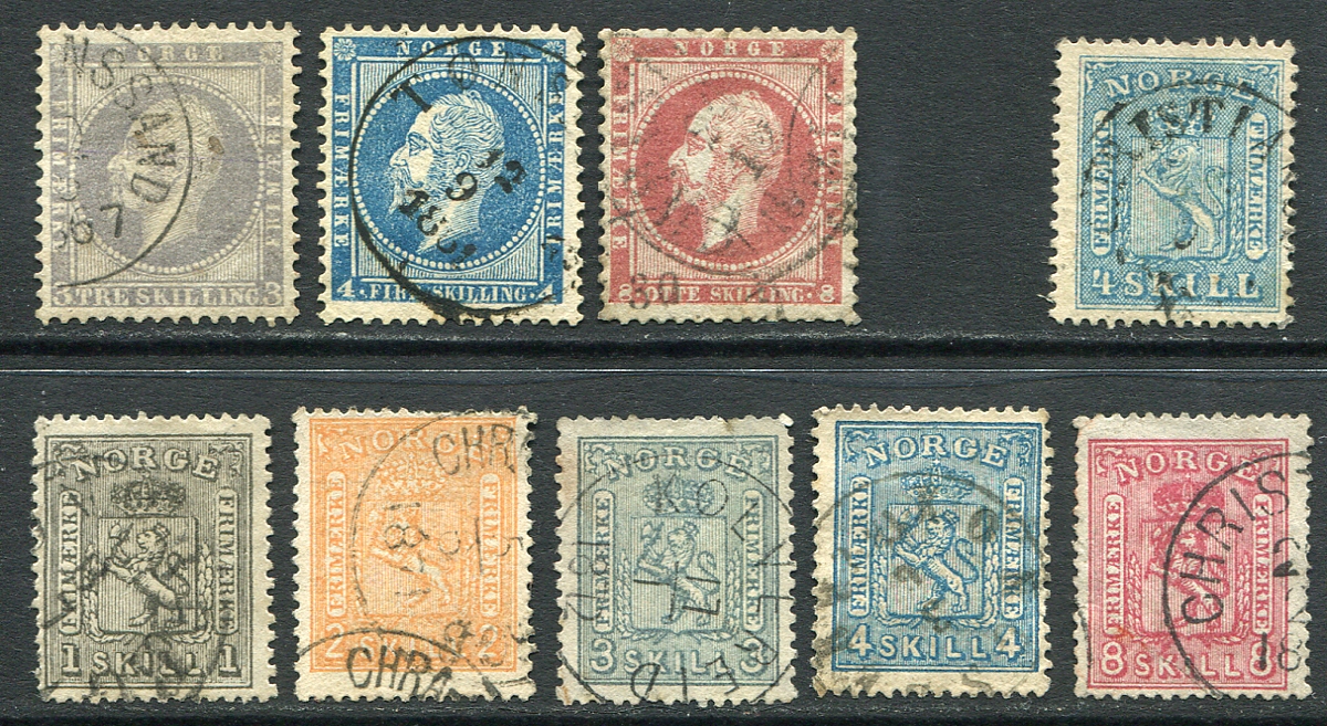 Terrific selection of nine early used singles. Starts with an Oscar I trio, a 4s Coat of Arms with crisscrossed background and five values with the "vertical background" Coat of Arms design. Most with readable circular date stamp cancellations. Solid condition. 2025 Scott US$473.00 =