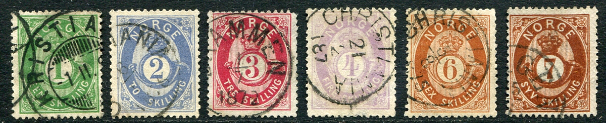 A sextet of the "skilling" denominated PostHorn set from 1872-1875. One of each denomination, the 2s is #17b and the 3s is #18a. Most have "Christiana" cancels. Usual mixed centering and a couple of shortish perfs (for the record). 2025 Scott US$335.00 =