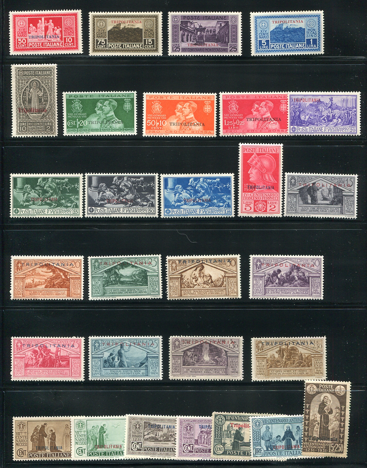 Five pages of gloriously mint Tripolitania, using neo-classical Italian designs, some overprinted on Italian stamps, others with North African themes. Missing only a couple of regular issues and airmails, the semi-postals are complete (the number of stamps doesn’t match up with the catalogue numbers as there are a number of gaps in the listings). All hinged, a couple with hinge remnants. An attractive group. 2025 Scott US$419.90 =