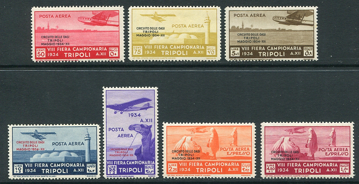 The complete mint hinged set of Tripoli (Libya) airmail stamps, overprinted for the 1934 "Circuit of the Oases" flights, showing airmail flights over classic African scenes. Includes the five regular airmail stamps and the two special delivery airmail stamps. 2025 Scott US$435.00 =