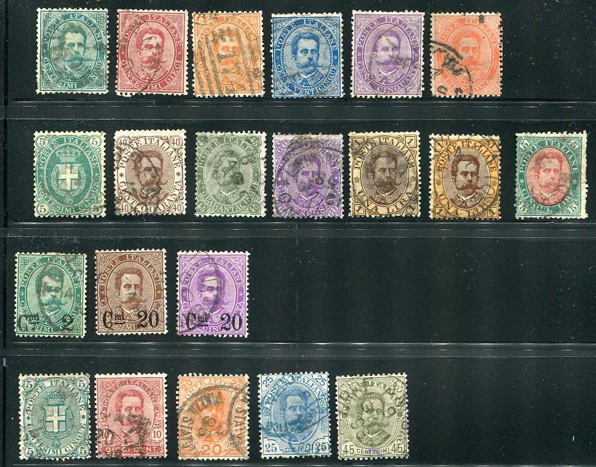 King Humbert I selection of 21 different used issues, including some overprints. Better includes #51 and #57, which look good, but see the footnote in Scott after #57 about forged cancellations. These two stamps catalogue $1425.00 and the balance of the lot catalogues over $250.00. 2025 Scott US$1680.15 =