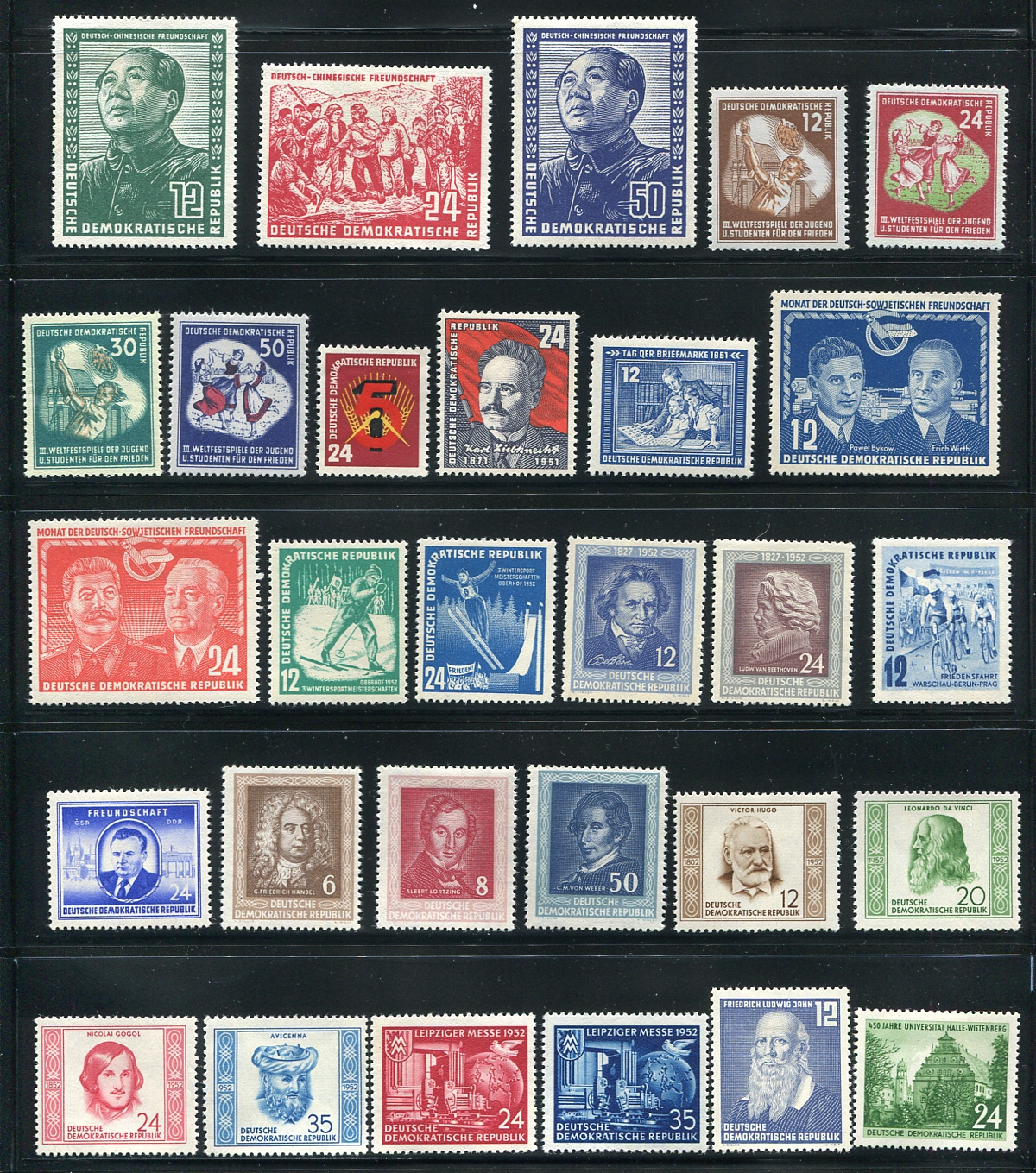 Unlike most offerings of early DDR, this complete mint run includes the "Chairman Mao" set. An attractive group, all hinged, a couple with selvedge counting numbers. A couple of short perfs can be seen, but it is otherwise the condition is good. 2025 Scott US$395.50 =