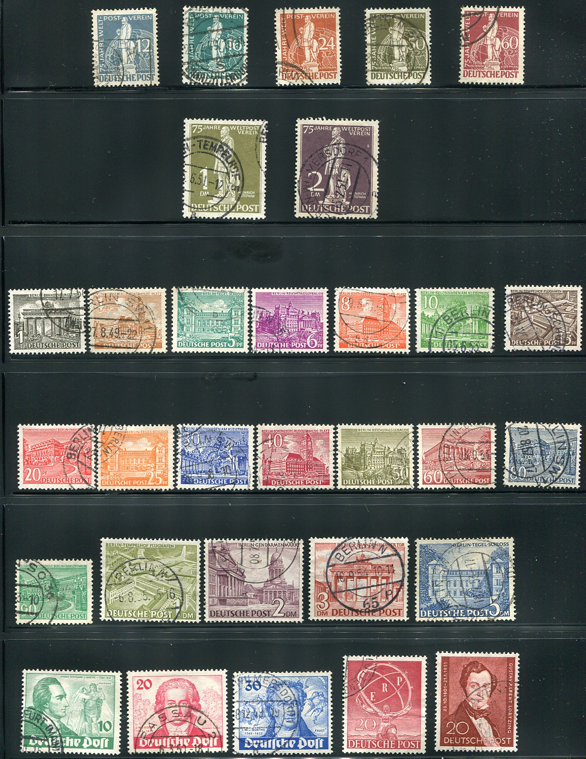 Three used sets and two singles of difficult to find early (1949-1951) Berlin issues. Includes the UPU 75th anniversary, the "Architecture" definitives and the Goethe sets. Some very nice cancels are in the mix. 2025 Scott US$436.75 =