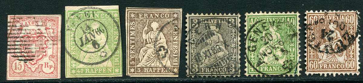 A six-pack of early used Swiss stamps, half imperf, the other half perforated, most with clean readable cancels. #12, #29, #36, #41, #47, #48. Usual mixed centering, but overall condition is solid. 2025 Scott US$722.50 =