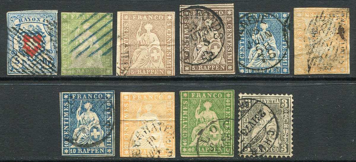 Ten used Swiss classics, with a "Coat of Arms" and nine, mostly imperforate, assorted "Seated Helvetia" design (#10, #19, #20, #24, #27, #34, #37, #39, #40, #42). A couple of nice cancels. The catch is that, despite their attractive appearance, all of these have significant faults (e.g. thins or paper splits). They will make very presentable space fillers in your collection. 2025 Scott US$1490.00 =