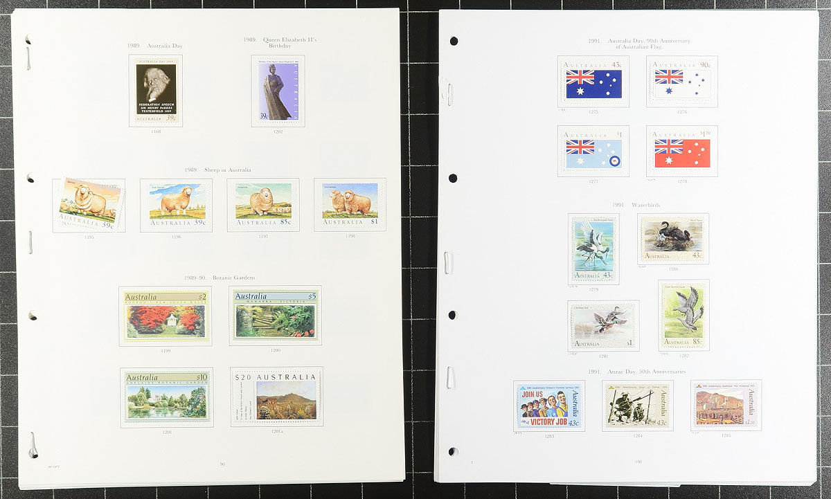 Consignment remainders of mint Australia, 1932-1993, containing many hundreds of stamps on several album pages and many thematic packs. The collection is primarily hinged onto pages ranging from Scott #130/1335, containing singles and sets, with the balance of the lot containing many never hinged sets from post office presentation packs. Owner's 2014 Scott catalogue value for the lot totals US$586.00, face value alone is over AUD$300.00. A nice clean lot from this popular collecting region, overall fine to very fine. Estimate =