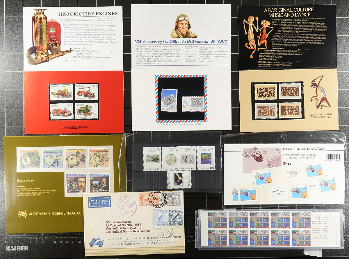 Consignment remainders of mint Australia, 1932-1993, containing many hundreds of stamps on several album pages and many thematic packs. The collection is primarily hinged onto pages ranging from Scott #130/1335, containing singles and sets, with the balance of the lot containing many never hinged sets from post office presentation packs. Owner's 2014 Scott catalogue value for the lot totals US$586.00, face value alone is over AUD$300.00. A nice clean lot from this popular collecting region, overall fine to very fine. Estimate =