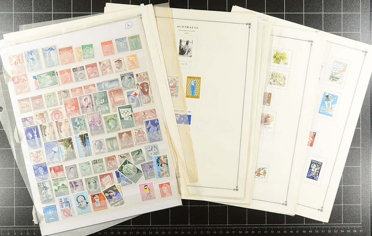 Consignment remainders of mint Australia, 1932-1993, containing many hundreds of stamps on several album pages and many thematic packs. The collection is primarily hinged onto pages ranging from Scott #130/1335, containing singles and sets, with the balance of the lot containing many never hinged sets from post office presentation packs. Owner's 2014 Scott catalogue value for the lot totals US$586.00, face value alone is over AUD$300.00. A nice clean lot from this popular collecting region, overall fine to very fine. Estimate =